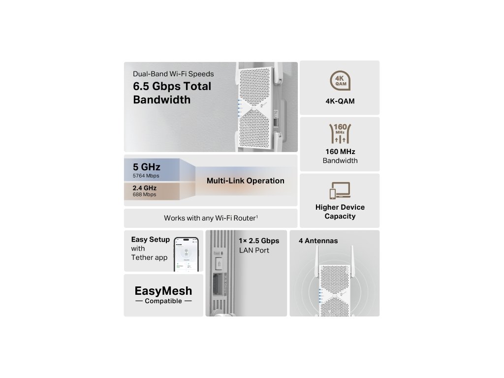 Inteligentný roaming a EasyMesh: Spolupracuje s kompatibilnými EasyMesh routermi a extendermi, aby vytvoril jednotnú Mesh sieť. To umožňuje plynulý prechod medzi miestnosťami bez výpadkov signálu a straty rýchlosti.