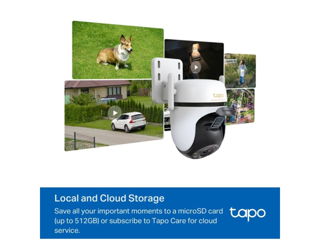 Bezpečné lokálne a cloudové úložisko - Uložte dôležité okamihy na kartu microSD (až 512 GB) alebo si po 30-dňovej bezplatnej skúšobnej dobe predplaťte cloudové úložisko Tapo Care, aby ste nikdy neprišli o dôležité zábery.