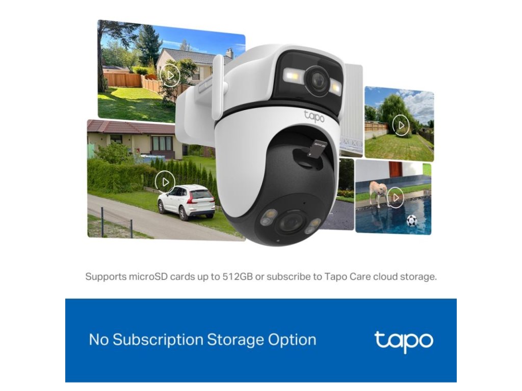 Lokálne aj cloudové úložisko: Podpora microSD karty až do 512 GB (nie je súčasťou balenia) alebo predplatné Tapo Care.