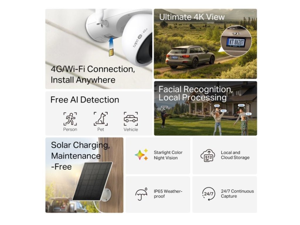 Sada Tapo C665G KIT New prináša revolúciu v monitorovaní. Táto solárne napájaná, otočná/naklápacia (Pan/Tilt) bezpečnostná kamera s Wi-Fi a 4G LTE konektivitou vám umožní strážiť váš majetok bez ohľadu na to, kde sa nachádza. Zabudnite na obmedzenia spôsobené nedostatkom Wi-Fi alebo elektrickej energie!