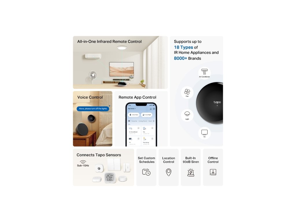 Tapo H110 je inteligentný IR ovládač a IoT hub, ktorý centralizuje ovládanie všetkých vašich infračervených zariadení.