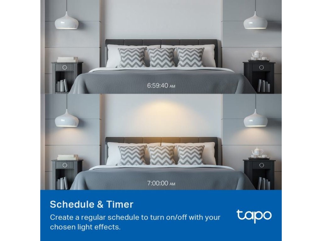 Diaľkové ovládanie a Režim neprítomnosti: Okamžite zapínajte a vypínajte svetlá odkiaľkoľvek prostredníctvom aplikácie Tapo. Aktivujte "Režim neprítomnosti", ktorý bude simulovať, že je niekto doma.