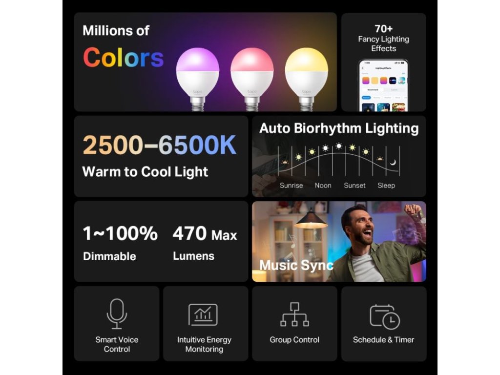 Synchronizácia so zvukom: Pomocou aplikácie Tapo zosynchronizujte svetlo žiarovky s hudbou a vytvorte pohlcujúci zážitok, kde svetlá tancujú do rytmu.