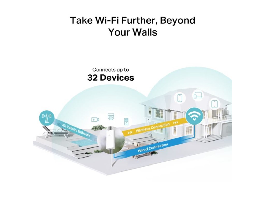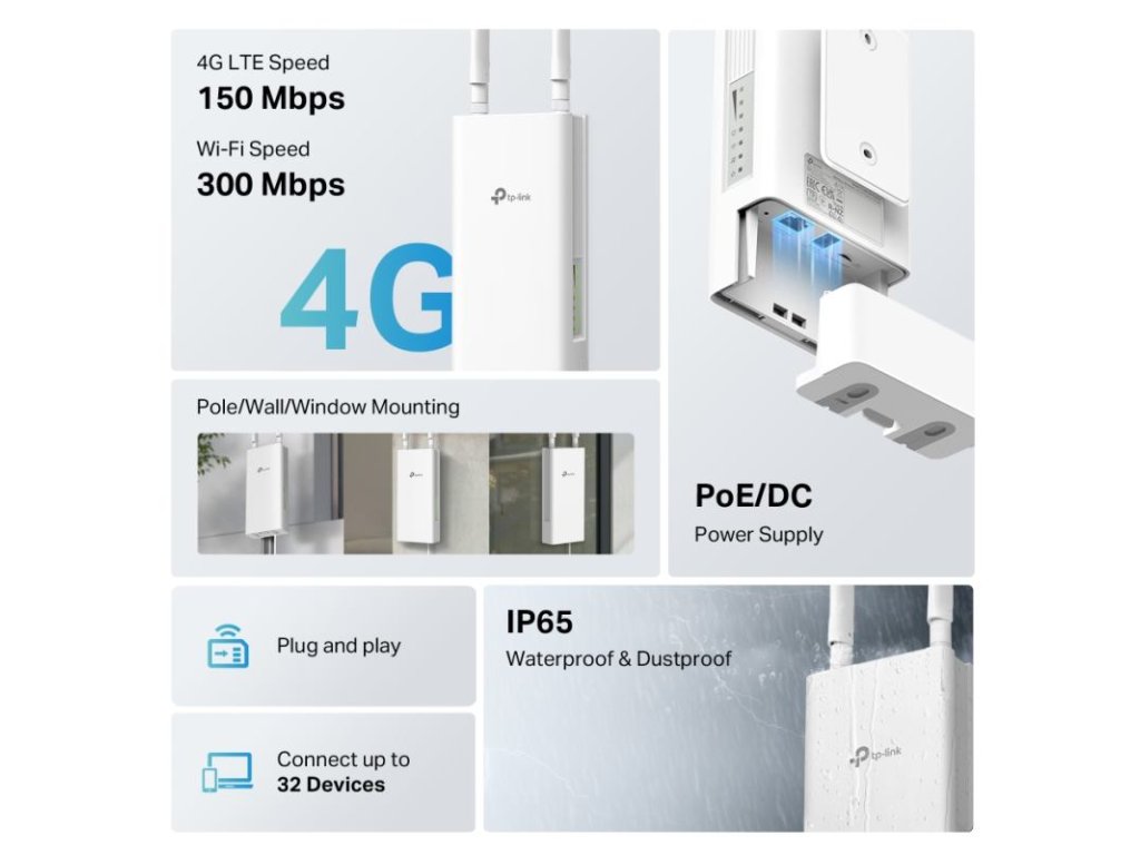 TL-MR100-Outdoor je vonkajší 4G Wi-Fi router, ktorý poskytuje rýchle internetové pripojenie prostredníctvom 4G LTE a Wi-Fi v exteriéri.