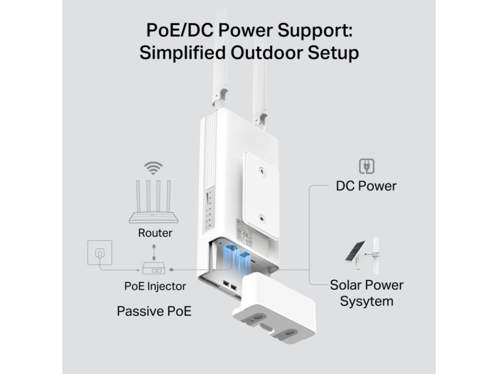 PoE/DC Power Supply: Podporuje 802.3af a pasívne PoE, čo umožňuje jednoduché nasadenie.