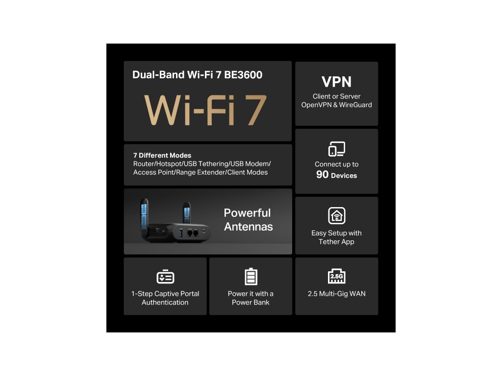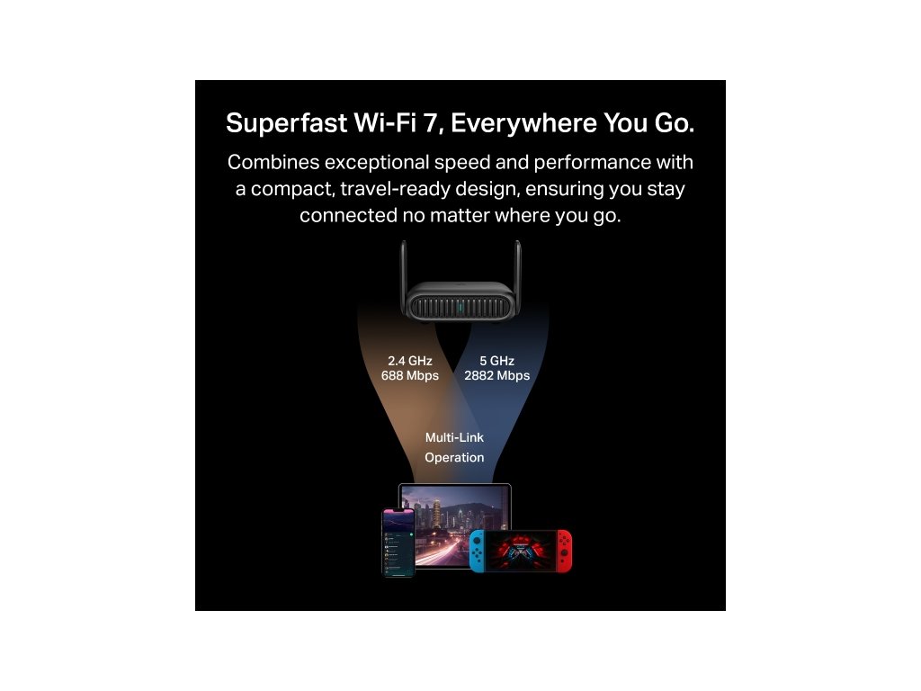 Tento prenosný cestovný router kombinuje najnovšiu technológiu Wi-Fi 7 a ponúka extrémne vysoké bezdrôtové rýchlosti, ktoré sú ideálne pre plynulé streamovanie videa, rýchle sťahovanie a online hranie bez prerušenia.