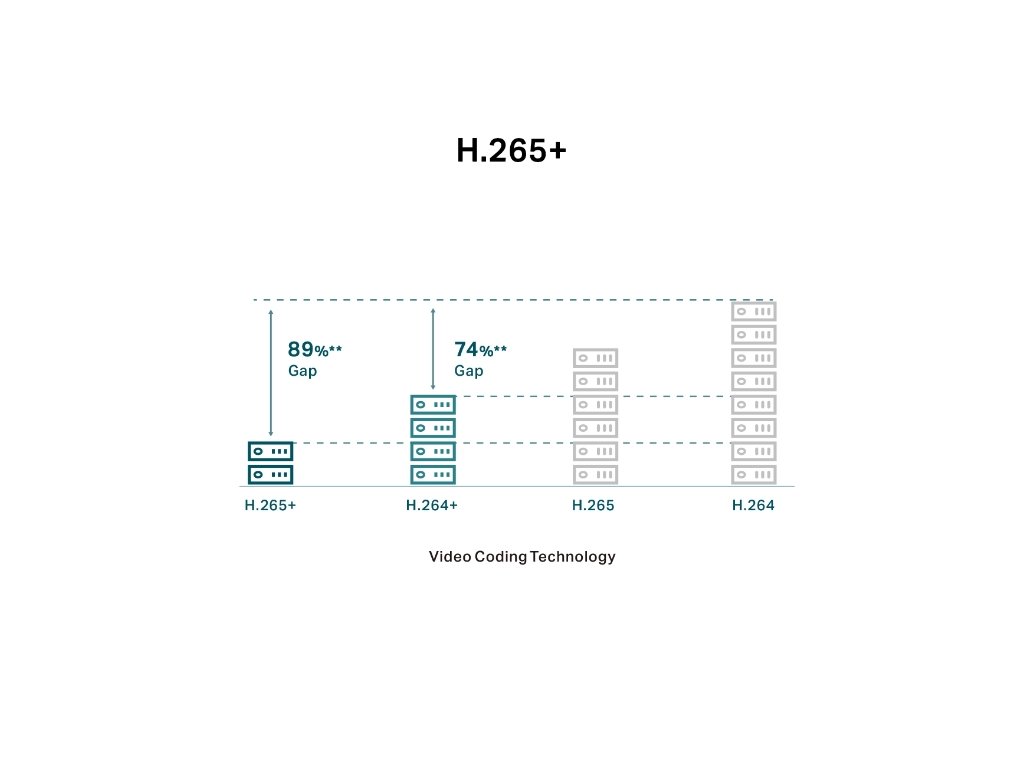 H.265+: Bez použitia ďalšej šírky pásma vaše kamery prenášajú komprimované krištáľovo čisté video, čím šetria miesto na disku, uľahčujú zaťaženie siete a znižujú náklady na monitorovanie bez obetovania kvality obrazu.