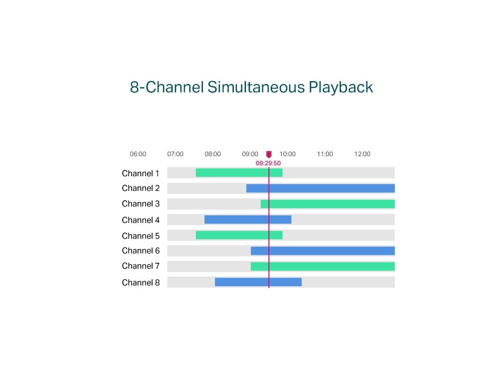 8-kanálové simultánne prehrávanie: Prehrávajte záznam až z 8 kamier súčasne, zvýšte rýchlosť prehrávania a vyhľadajte udalosti v pláne videa, aby ste si mohli jednoducho prezerať zábery.