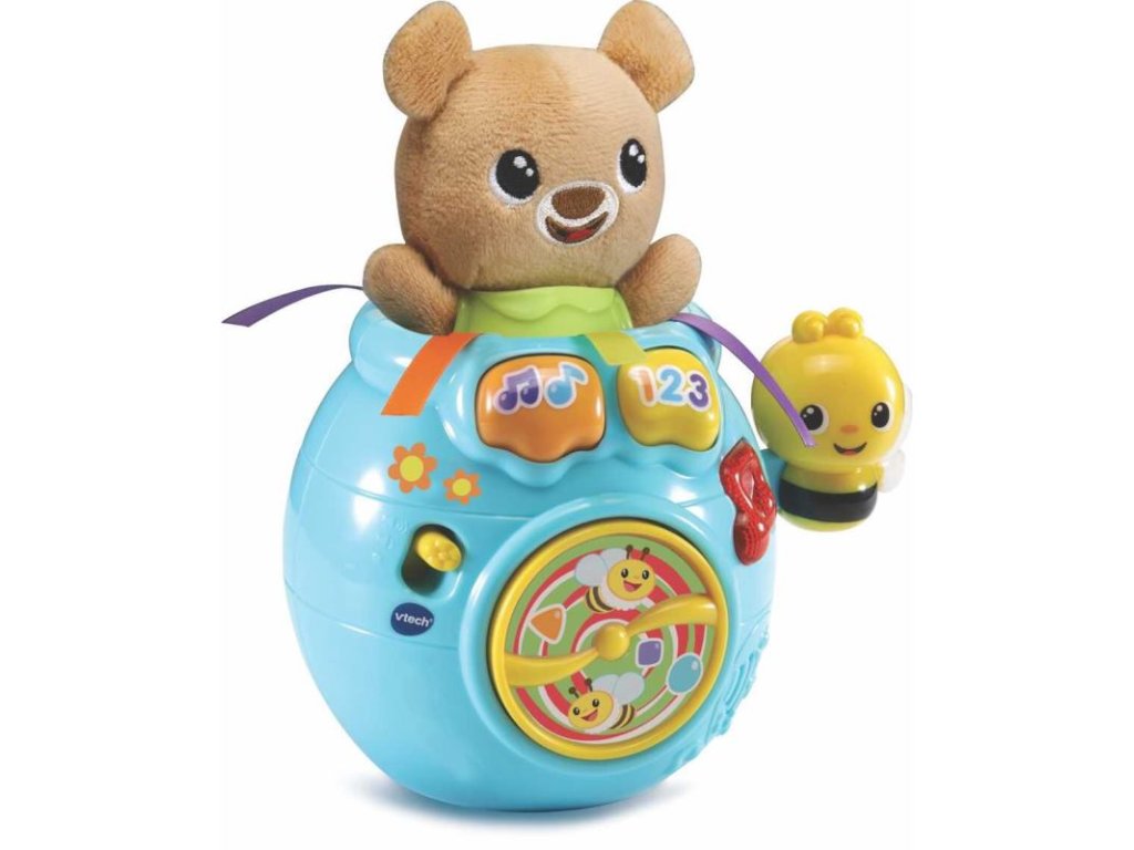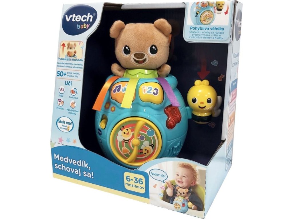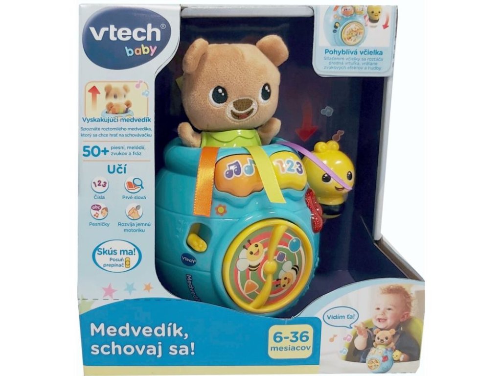 Vtech Medvedík, schovaj sa! je legendárna hudobná a vzdelávací hračka pre deti už od 6 mesiacov. Roztomilými frázami interaktívne komunikuje s dieťaťom. Ľahkým zatlačením medvedíka do hrnca so medvedík schová. Následným stlačením tlačidla medvedík "vyskočí" z hrnca von. Všetko je sprevádzané zábavnými frázami, piesňami a melódiami. Pohyblivá včielka na boku hrnca s medom dokáže tiež roztočiť vrtuľku na prednej časti hrnca.