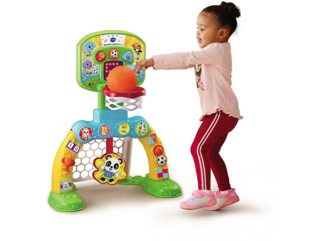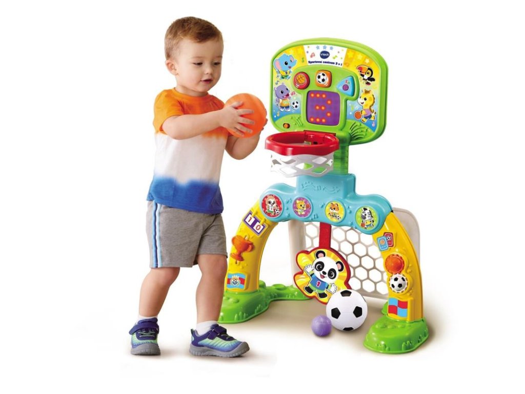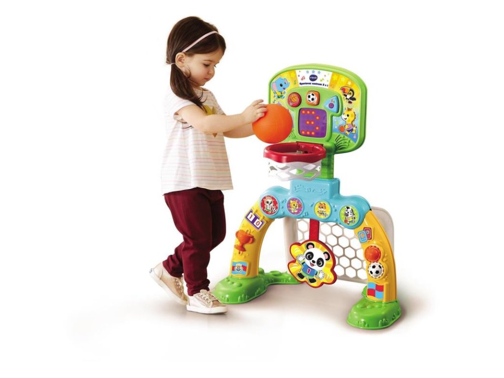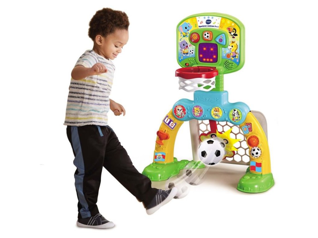 Vtech Športové centrum má basketbalový kôš s počítačom vhodených košov. Pre malých futbalistov je súčasťou aj futbalová brána s roztomilým brankárom, ktorý vie zareagovať na každý úspešný kop. Súčasťou Vtech Športového centra 3 v 1 je malá futbalová a basketbalová lopta.