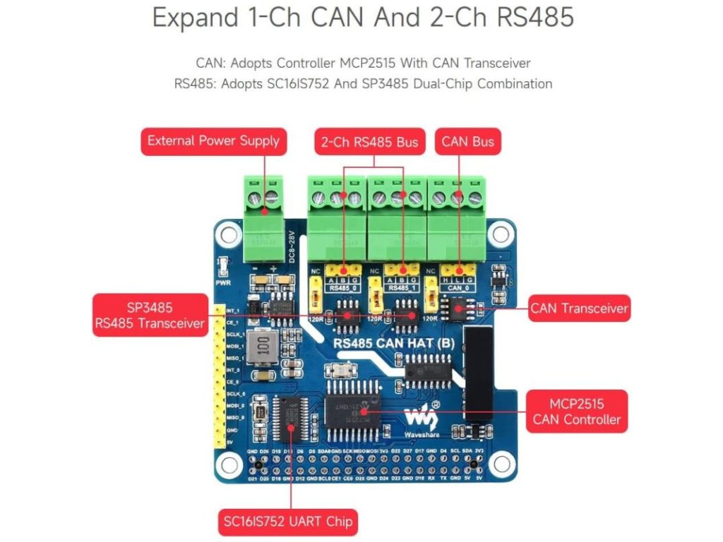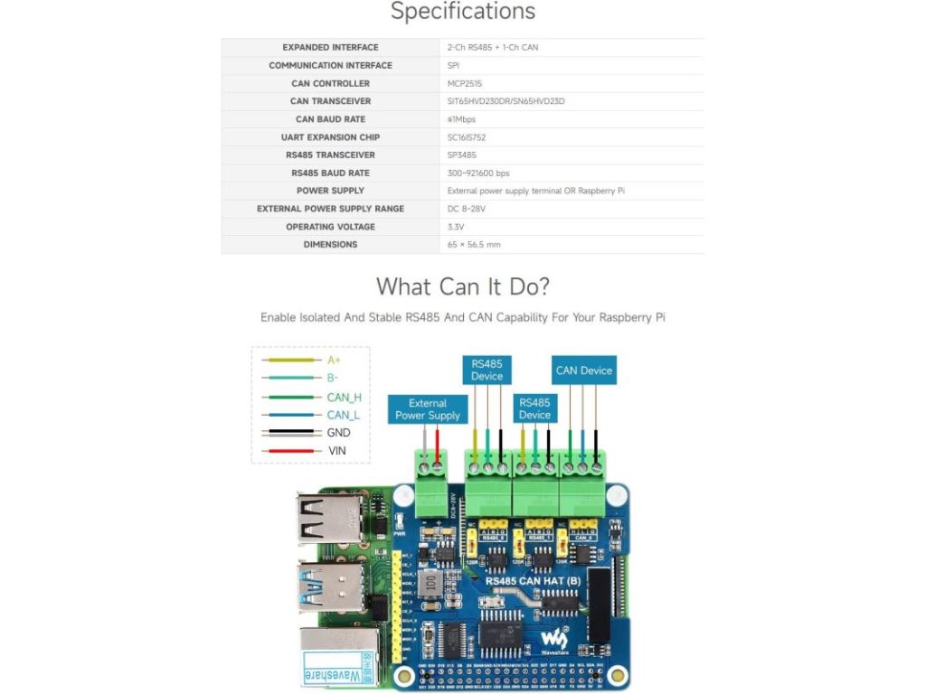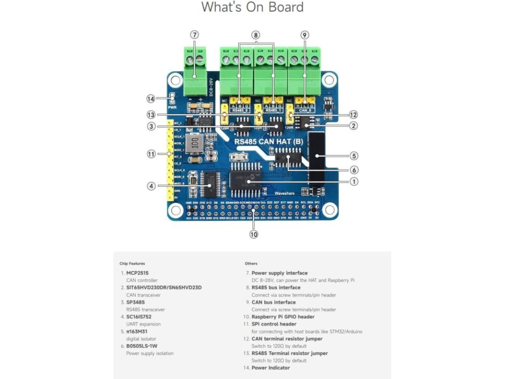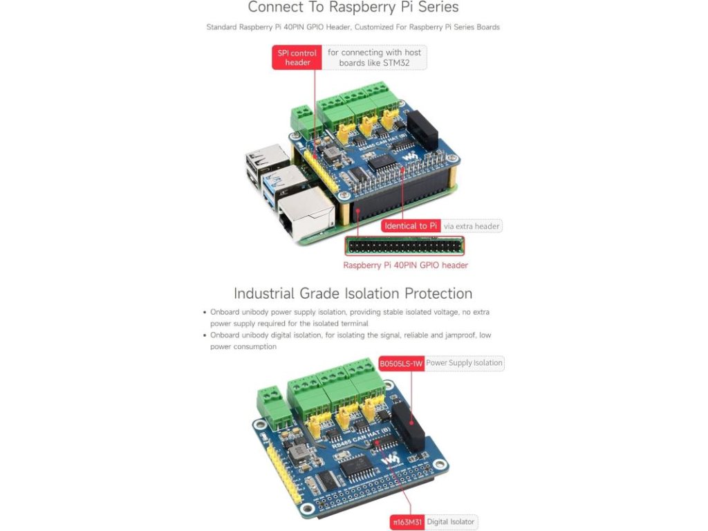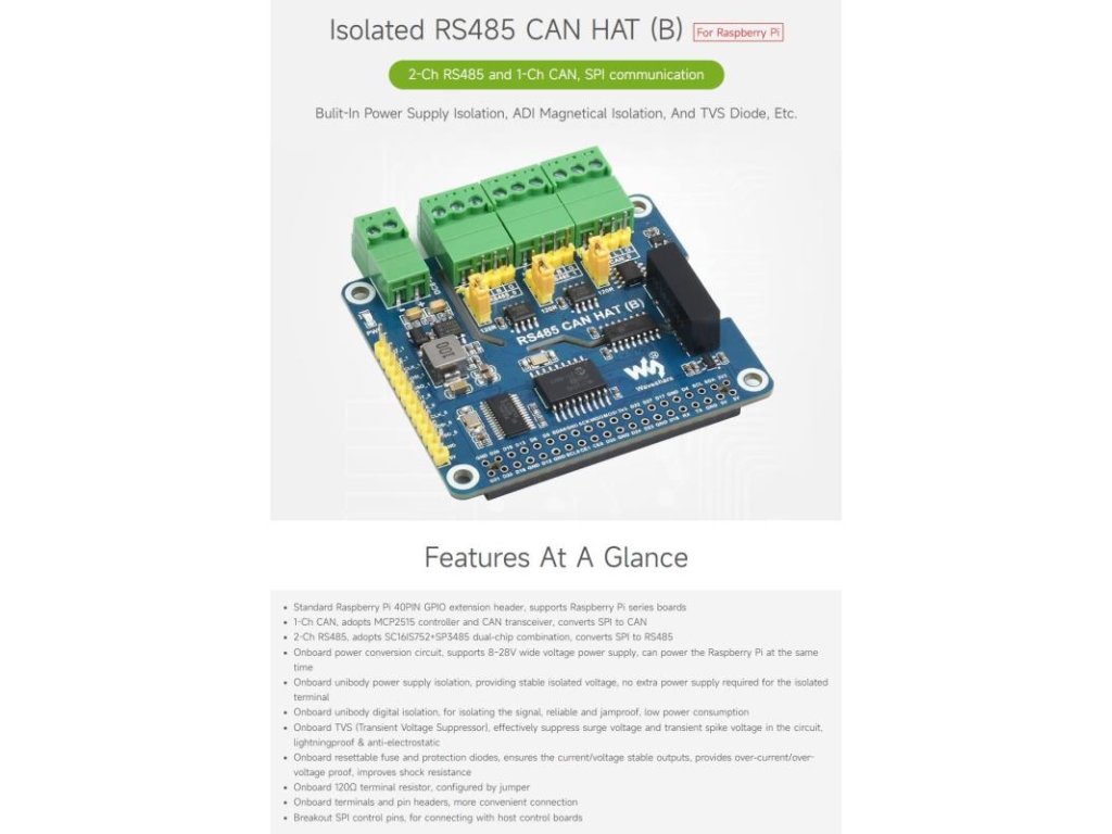 Waveshare izolovaný RS485 CAN HAT B je rozšírenie pre Raspberry Pi, ktoré umožňuje komunikáciu cez RS485 a CAN protokoly. Tento modul je vybavený izoláciou, čo zvyšuje bezpečnosť a spoľahlivosť pri prenose dát.
